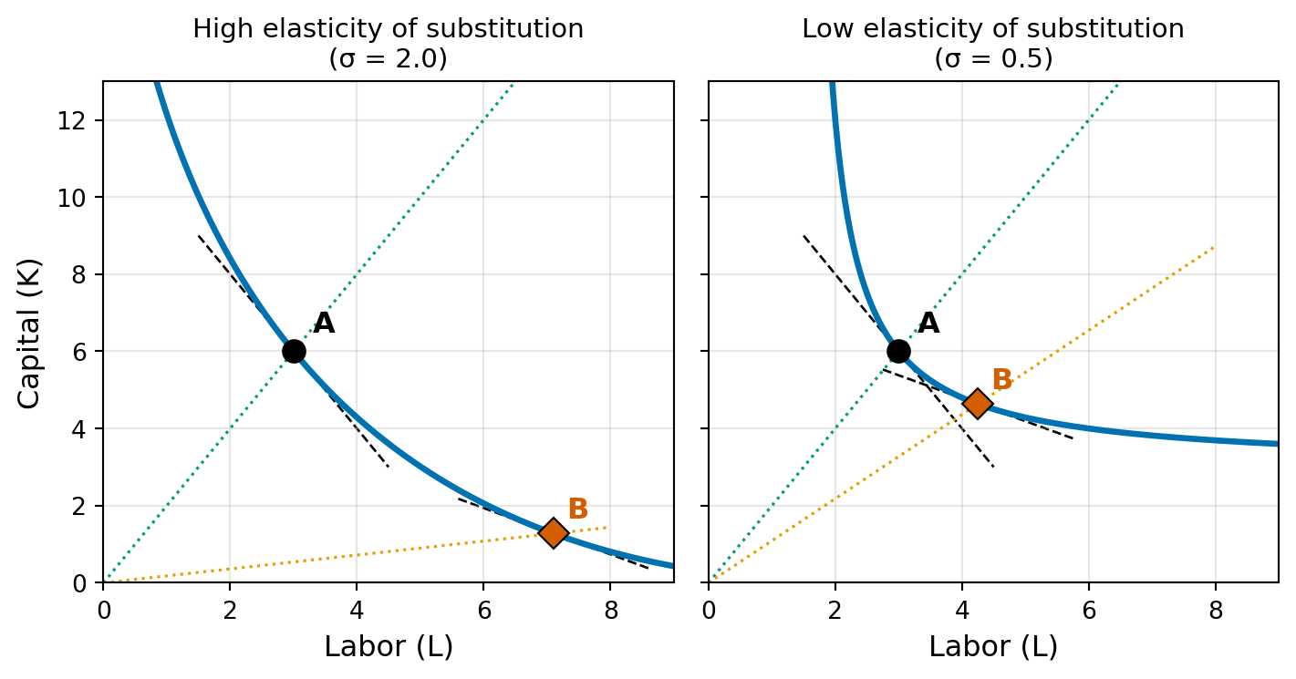 In the above example, both isoquants start at point A with K/L = 2.0 and MRTS = 2.0. At point B, both have the same new MRTS of 0.6. So the change in the marginal rate is identical. But look at how differently the input mix responds. With high σ, K/L plummets from 2.0 to 0.18: the firm dramatically shifts toward labor. With low σ, K/L moves by much less, from 2.0 to 1.09.