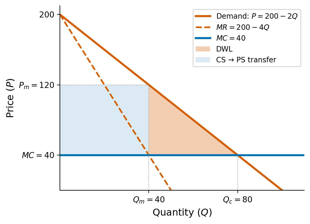 Inverting: \(P = 80 - Q/2\). Marginal revenue: