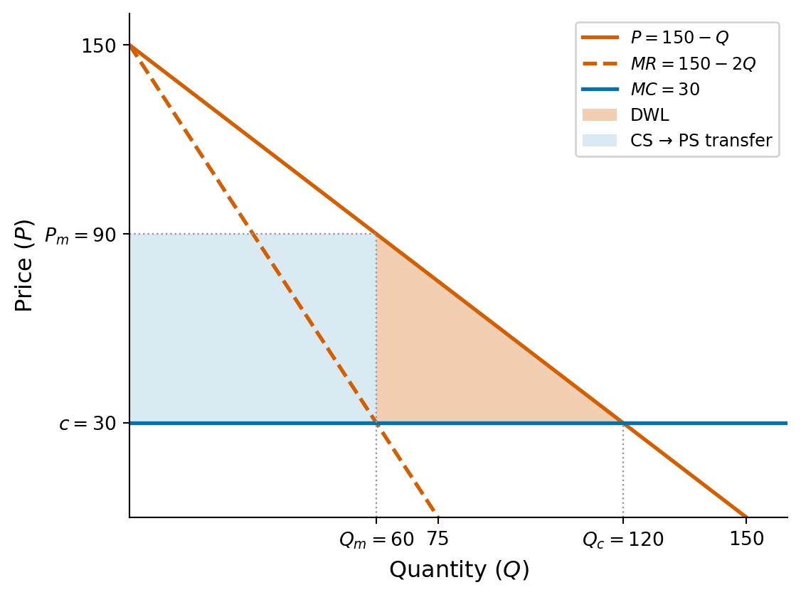 - Cournot duopoly (\(n = 2\)): \(DWL = 7{,}200/9 = \$800\)